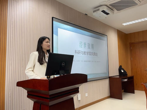最后是来自学科教学(语文)的白思思同学与大家进行分享,她讲解的主题为“经世致用:科研与教学双向奔赴”,她将科研与教学两者相结合,并提倡科研与教学的双向奔赴是推动教育高质量发展的必由之路。一方面,科研能够为教学提供源源不断的创新理念和前沿知识,使教学内容更加贴近时代需求,激发学生的学习兴趣和求知欲;另一方面,教学能够为科研提供实践基地和人才支持,推动科研成果的转化和应用,实现科研价值的最大化。