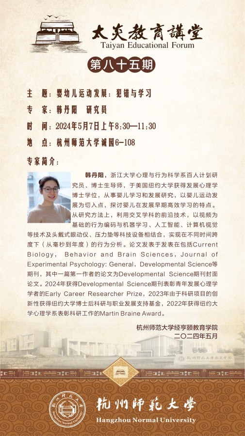 韩丹阳,浙江大学心理与行为科学系百人计划研究员、博士生导师,于美国纽约大学获得发展心理学博士学位,从事婴儿学习和发展研究,以婴儿运动发展为切入点,探讨婴儿在发展早期高效学习的特点。从研究方法上,利用交叉学科的前沿技术,以视频为基础的行为编码与机器学习、人工智能、计算机视觉等技术及头戴式眼动仪、压力垫等科技设备相结合,实现在不同时间跨度下(从毫秒到年度)的行为分析。论文发表于发表在包括Current Biology, Behavior and Brain Sciences,Journal of Experimental Psychology: General,Developmental Science等期刊,其中一篇第一作者的论文为Developmental Science期刊封面论文。2024年获得Developmental Science期刊表彰青年发展心理学学者的Early Career Researcher Prize,2023年由于科研项目的创新性获得纽约大学博士后科研与职业发展支持基金,2022年获得纽约大学心理学系表彰科研工作的Martin Braine Award。