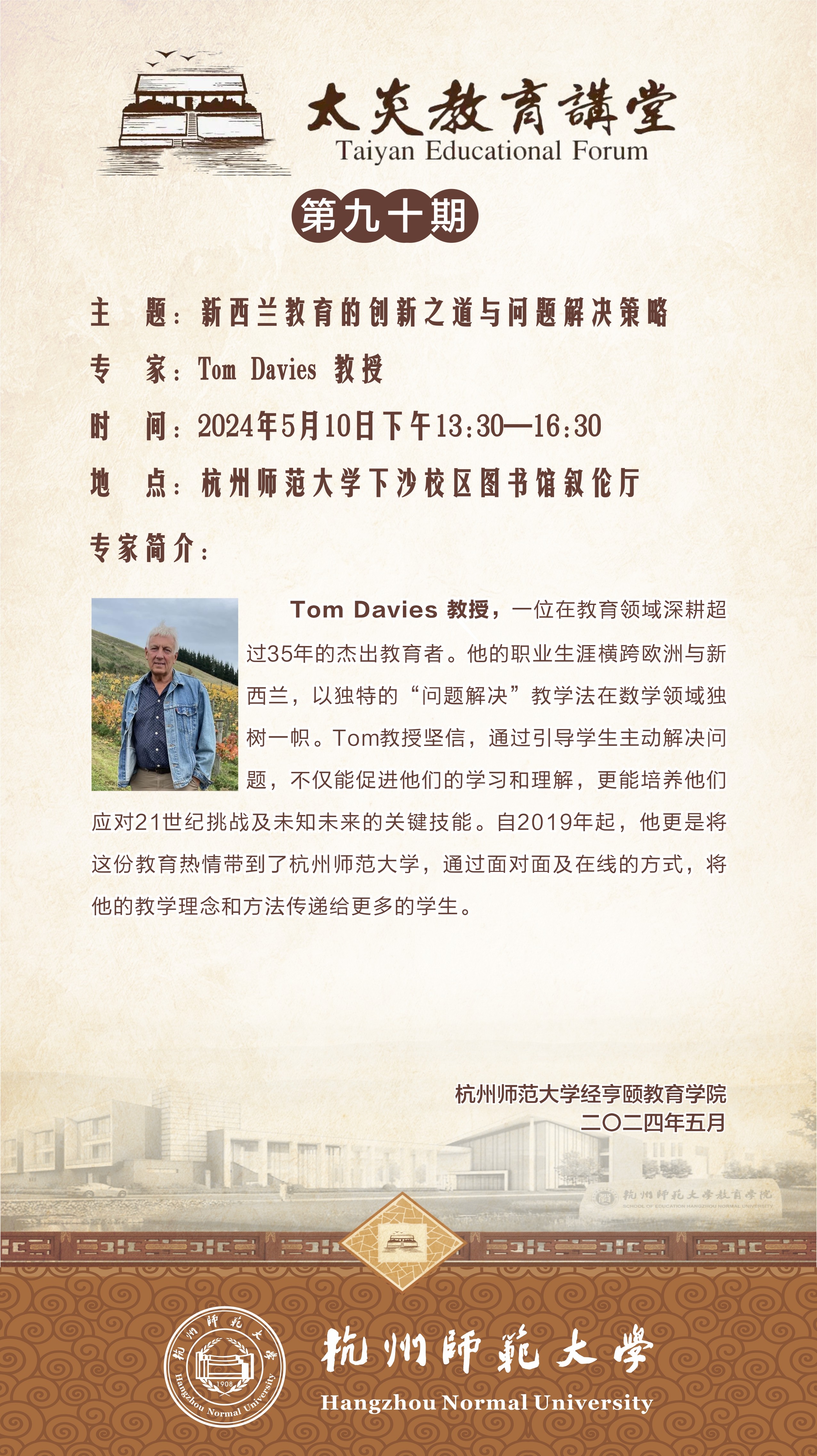 Tom Davies教授,一位在教育领域深耕超过35年的杰出教育者。他的职业生涯横跨欧洲与新西兰,以独特的“问题解决”教学法在数学领域独树一帜。Tom教授坚信,通过引导学生主动解决问题,不仅能促进他们的学习和理解,更能培养他们应对21世纪挑战及未知未来的关键技能。自2019年起,他更是将这份教育热情带到了杭州师范大学,通过面对面及在线的方式,将他的教学理念和方法传递给更多的学生。