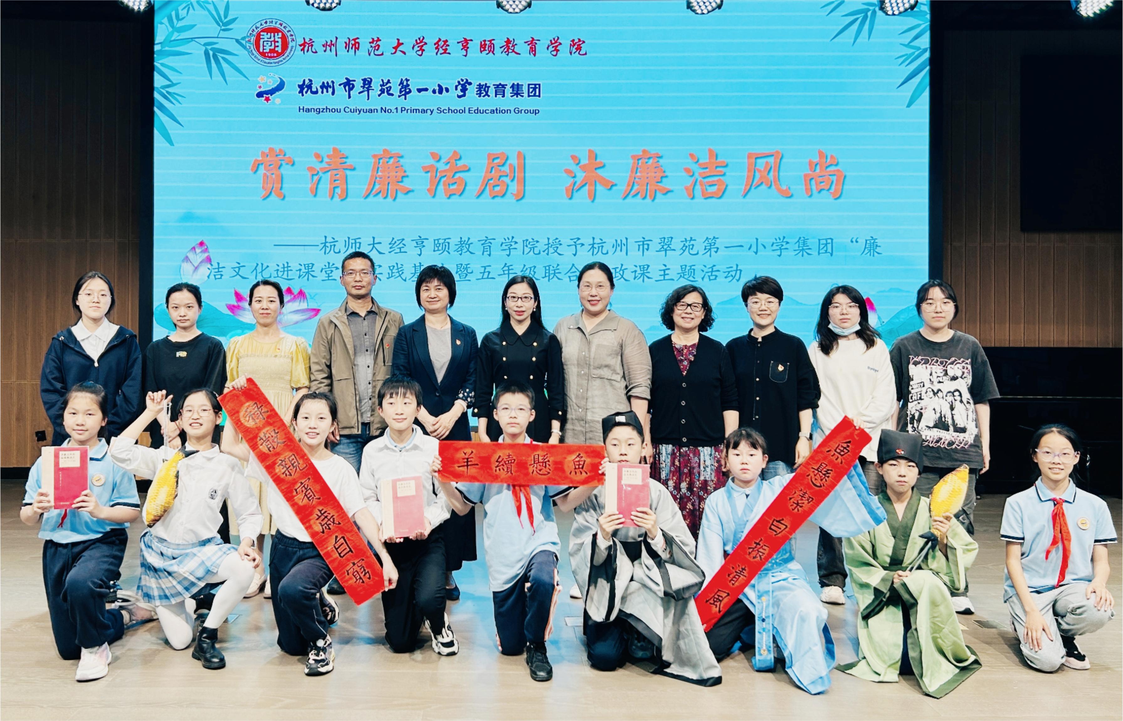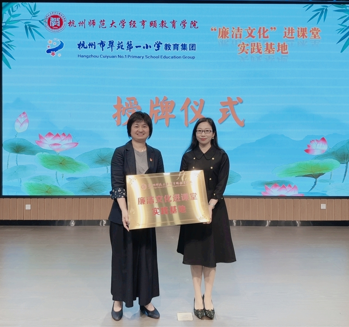 天英足球即时比分 一直致力于建设“望道廉行”廉洁文化品牌,率先在大学生课程中推行廉洁教育,鼓励00后大学生“剧”说廉洁,在古诗文中感悟民族文化,廉洁风尚,将廉洁文化融入课堂。在本次思政主题教育中,天英足球即时比分 党委副书记、纪委书记沈嫣代表学院授予杭州市翠苑第一小学“廉洁文化进课堂”实践基地,期待通过大学生的实习实践和学院经验助力实践基地的廉洁教育。共同见证授牌仪式的还有课程与教学系副教授梁晓凤和学院纪委委员程骁老师。
