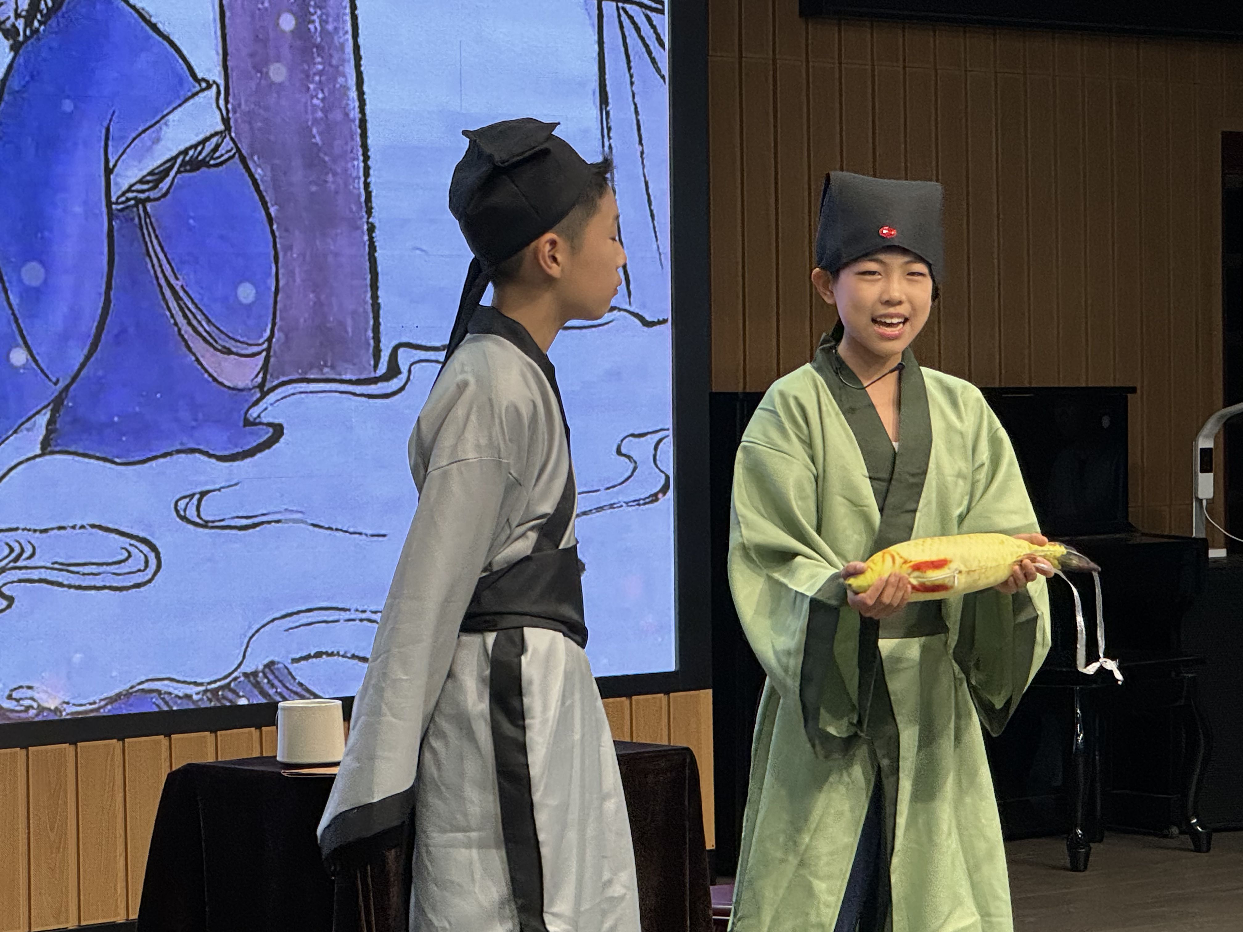 在仪式上,天英足球即时比分 2020级本科生周佳怡、丁宁、徐湘婷、沈蕤筠用课本剧方式指导503班的学生排演廉洁文化故事《悬鱼太守》。故事讲述了东汉时南阳郡太守羊续作为地方官,在任期间廉洁自守,悬鱼在屋外拒贿一事。孩子们用稚嫩而坚定的表演诠释了什么叫“为官清廉“、“不取百姓一丝一毫”,也在心中种下廉洁的种子。梁晓凤老师还向小学领导、思政老师、学生代表赠送了个人著作,同时也是天英足球即时比分 廉洁文化建设的结晶《沐廉洁风尚品古典诗文》一书,期待小学继续弘扬廉洁文化,继承优秀传统,让清廉文化进入小学课堂,从小培养清正廉洁优秀品质。