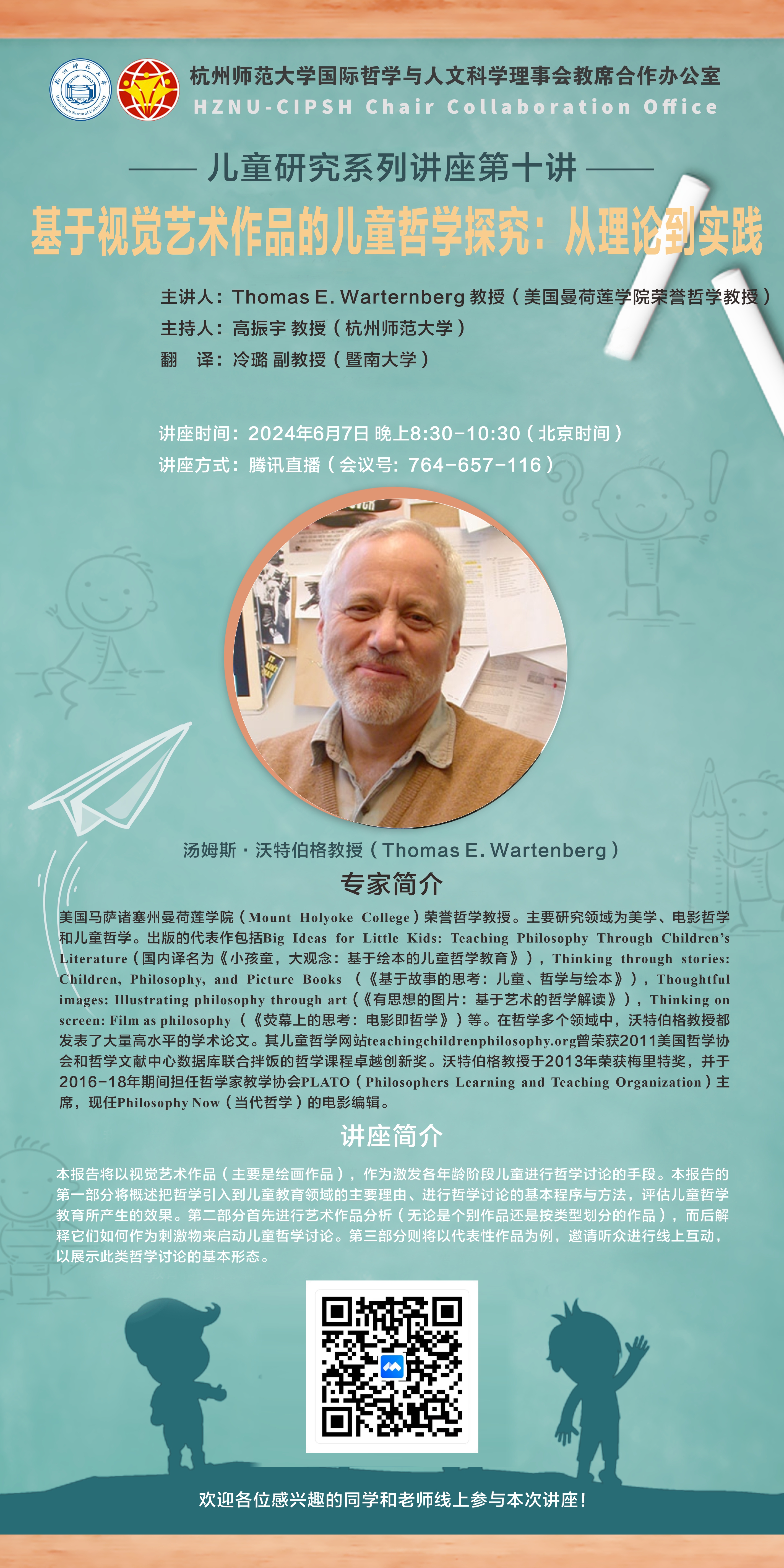 Thomas E. Wartenberg 汤姆斯·沃特伯格,美国马萨诸塞州曼荷莲学院(Mount Holyoke College)荣誉哲学教授。主要研究领域为美学、电影哲学和儿童哲学。出版的代表作包括Big Ideas for Little Kids: Teaching Philosophy Through Children’s Literature(国内译名为《小孩童,大观念:基于绘本的儿童哲学教育》),Thinking through stories: Children, Philosophy, and Picture Books (《基于故事的思考:儿童、哲学与绘本》),Thoughtful images: Illustrating philosophy through art (《有思想的图片:基于艺术的哲学解读》),Thinking on screen: Film as philosophy (《荧幕上的思考:电影即哲学》)等。在哲学多个领域中,沃特伯格教授都发表了大量高水平的学术论文。其儿童哲学网站teachingchildrenphilosophy.org曾荣获2011美国哲学协会和哲学文献中心数据库联合拌饭的哲学课程卓越创新奖。沃特伯格教授于2013年荣获梅里特奖,并于2016-18年期间担任哲学家教学协会PLATO(Philosophers Learning and Teaching Organization)主席,现任Philosophy Now(当代哲学)的电影编辑。