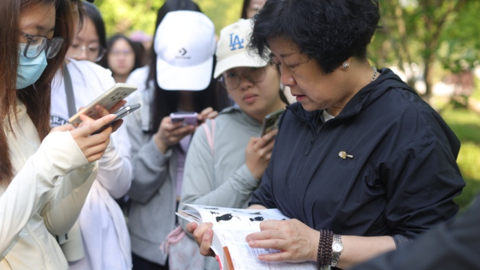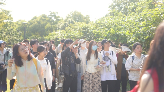 观鸟活动正式开始前,钱程老师为同学们详细介绍了观鸟前需要做的准备事项以及观鸟过程当中的注意点,包括望远镜的使用方法、最适宜的观鸟时段、视听结合的观鸟方法等等。同学们全神贯注地聆听注意事项,并以小组为单位实践望远镜的正确使用。