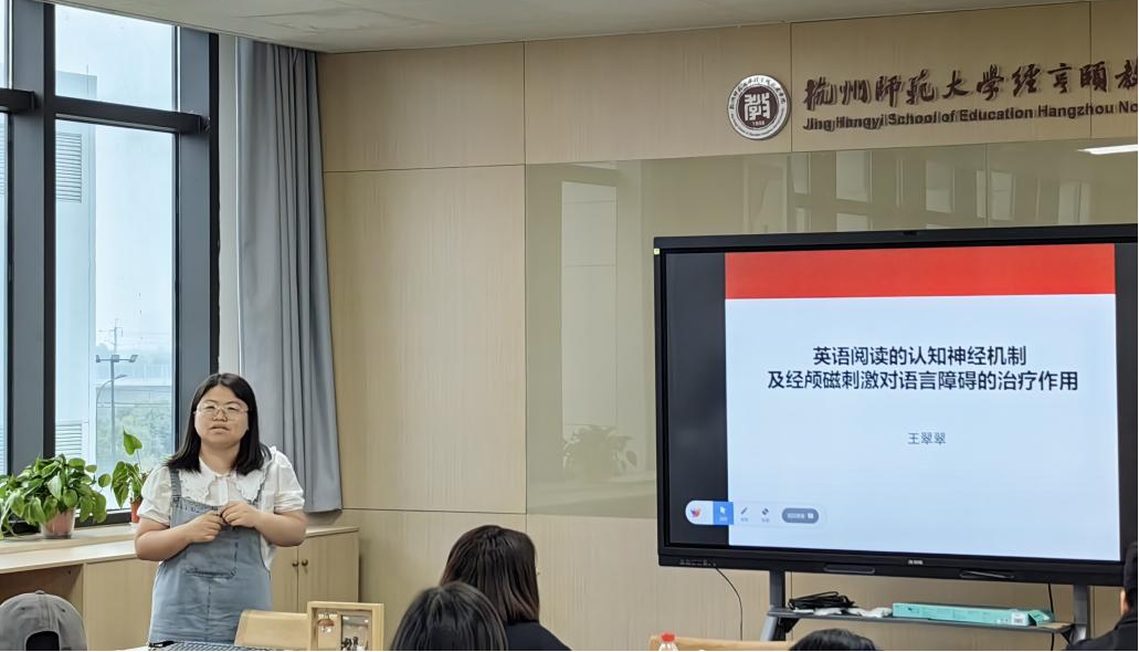 沙龙主讲人王翠翠博士主讲的题目是“英语阅读的认知神经机制及经颅磁刺激对语言障碍的治疗作用”。王翠翠博士从研究背景、研究思路、研究设计和研究结果以及讨论等方面揭示了汉语母语者学习英语的神经机制,以及不同学习经验对汉语母语者英语学习的影响。汉语和英语是两种差异非常大的语言体系,字母-语音整合是学习英语阅读的关键技能,但是汉语母语者在学习英语时却存在很多的困难,无法成功自动化地整合英语字母-语音。王翠翠的研究发现,英语沉浸式学习经验、特异化的训练经验以及非语言特异的音乐学习经验可以有效促进汉语母语者的英语学习。李松泽博士指出,这项研究非常有意义,这个讲座解答了她的很多疑惑,即为何有沉浸经验的英语学习者的英语水平比没有沉浸经验的学习者要好,而且也更为深入地理解了背后的神经机制。赛李阳老师指出,王老师的讲解非常生动,逻辑非常鲜明,希望研究生同学能够受益。