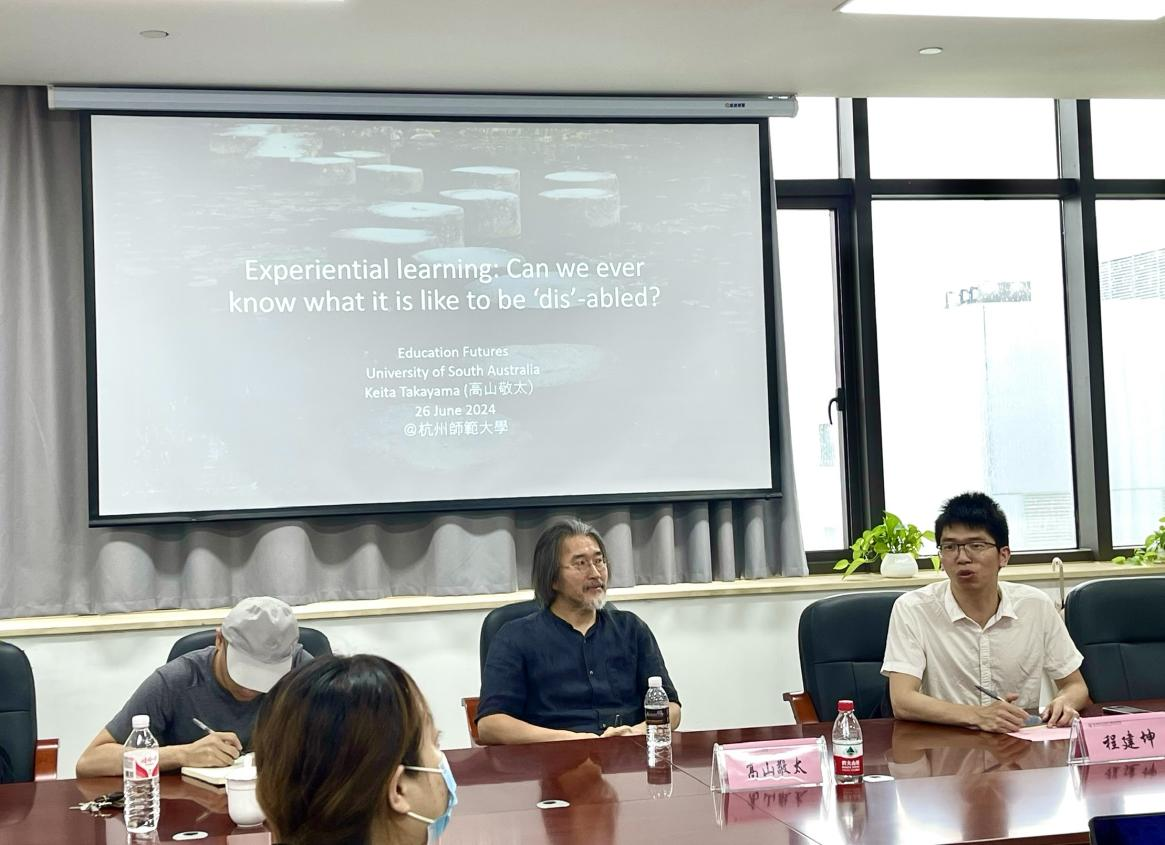 2024年6月27日上午,南澳大利亚大学未来教育研究所高山敬太教授应邀来到天英足球即时比分 ,为天英足球即时比分 师生带来了一场主题为“体验式学习:我们能知道残障是什么感觉吗?”的讲座。讲座由程建坤副教授主持,陆伟博士负责翻译,学院30多名师生参加了本次讲座。