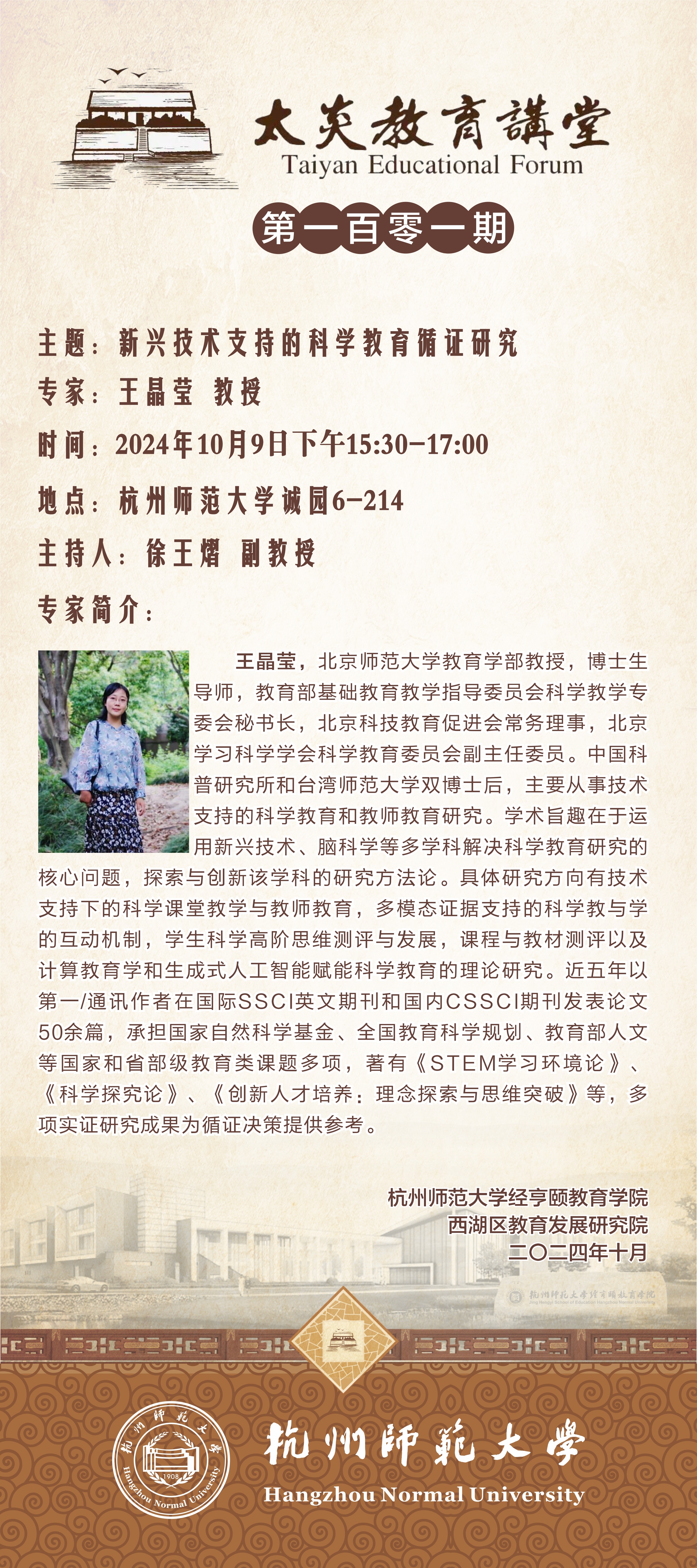 王晶莹,北京师范大学教育学部教授,博士生导师,教育部基础教育教学指导委员会科学教学专委会秘书长,北京科技教育促进会常务理事,北京学习科学学会科学教育委员会副主任委员。中国科普研究所和台湾师范大学双博士后,主要从事技术支持的科学教育和教师教育研究。学术旨趣在于运用新兴技术、脑科学等多学科解决科学教育研究的核心问题,探索与创新该学科的研究方法论。具体研究方向有技术支持下的科学课堂教学与教师教育,多模态证据支持的科学教与学的互动机制,学生科学高阶思维测评与发展,课程与教材测评以及计算教育学和生成式人工智能赋能科学教育的理论研究。近五年以第一/通讯作者在国际SSCI英文期刊和国内CSSCI期刊发表论文50余篇,承担国家自然科学基金、全国教育科学规划、教育部人文等国家和省部级教育类课题多项,著有《STEM学习环境论》、《科学探究论》、《创新人才培养:理念探索与思维突破》等,多项实证研究成果为循证决策提供参考。