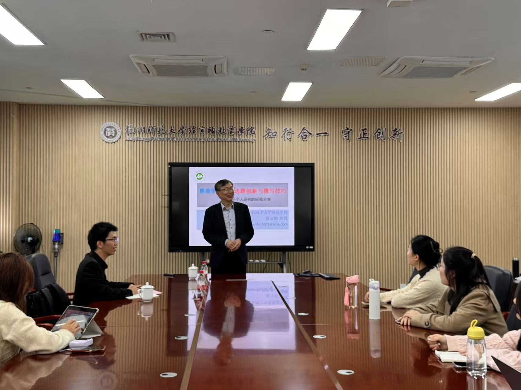 2024年10月29日下午,石河子大学师范学院教授、博士生导师,中国现代教育管理专业委员会副理事长,以及中国高等教育学专业委员会等机构常务理事蔡文伯教授,受邀做客第一百零五期“太炎教育讲堂”。此次讲座以“教育学术论文选题创新与撰写技巧”为主题,由程建坤教授主持,吸引了本院二十余名学生积极参与。