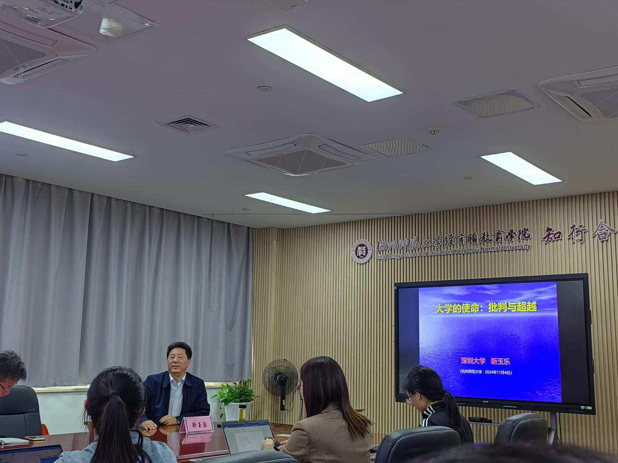 11月4日下午,深圳大学教育部主任、文科资深教授、博士生导师靳玉乐教授应邀做客第一百零六期太炎教育讲堂,作题为“大学的使命:批判与超越”的讲座,讲座由肖正德教授主持,学院50余名师生参加。