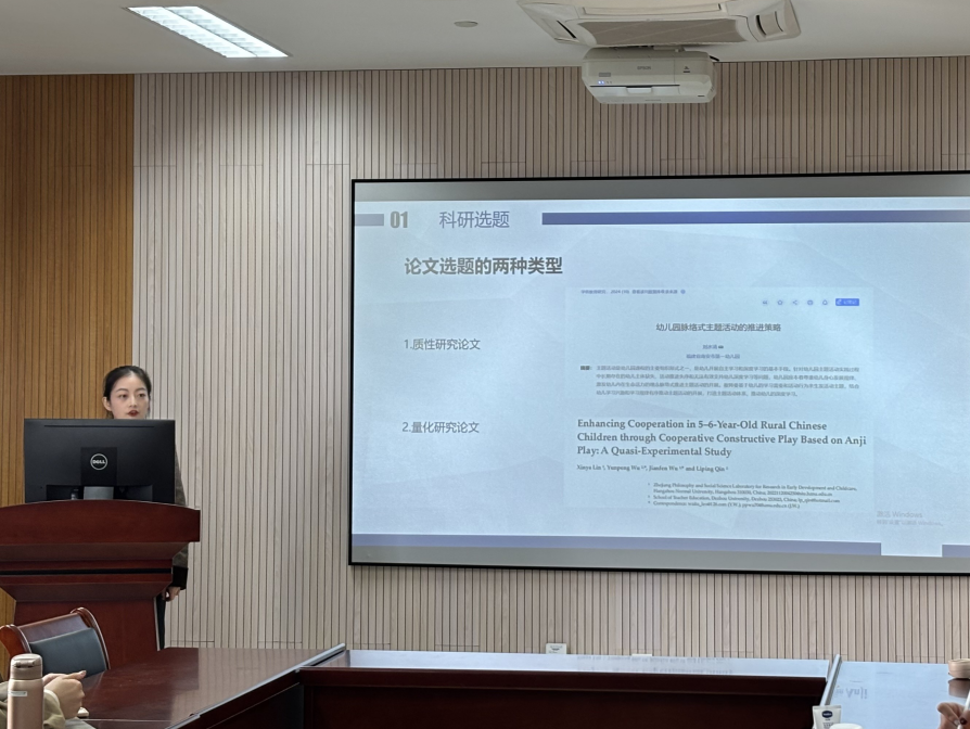 林鑫涯首先从选题、写作、投稿以及心态四个方面,围绕“科研写作经验分享”主题展开演讲。硕士在读期间,她曾以负责人身份主持校级科研项目《乡村振兴背景下幼儿教师绘本阅读教学的现状研究》成功立项并结题,以第一作者身份公开发表2篇论文,其中1篇被收录在SSCI二区期刊之中,并在第二届婴幼儿发展与托育国际学术会议等多项会议上汇报论文并获得优秀报告,有着丰富的科研写作经验。
