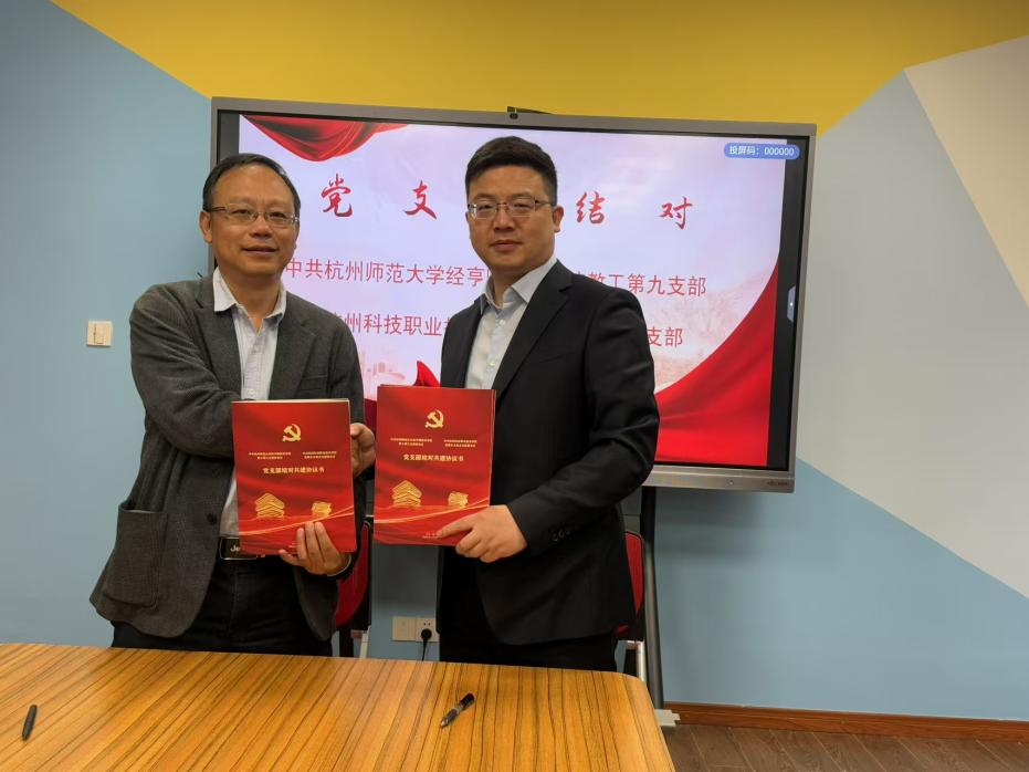 为进一步夯实党建工作基础,增进跨校支部间学习交流,促进支部融合发展,增强基层党建工作新动力,构建基层党建工作新格局,加强组织联建、党员互动、活动互联、资源共享,促进校际党支部间党建工作经验交流。2024年11月20日,学院教工第九党支部与杭州科技职业技术学院教工第五党支部签订了结对共建协议。