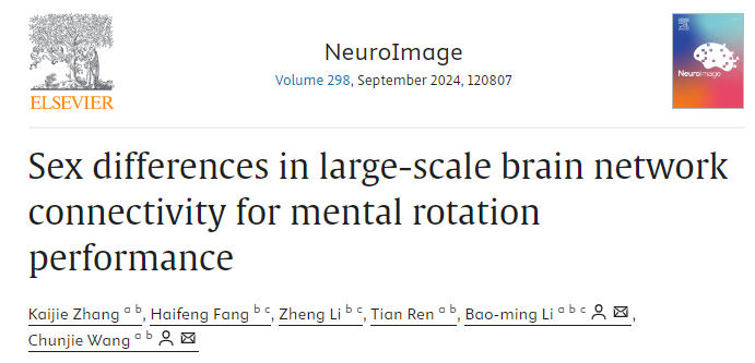 近日,脑科学研究所认知神经科学研究团队(王春杰、李葆明)在心理旋转操作(mental rotation performance)性别差异的脑机制研究方面取得重要进展,研究论文以“心理旋转性别差异的大尺度脑网络连接机制”(Sex differences in large-scale brain network connectivity for mental rotation performance)为题发表在神经影像学著名杂志NeuroImage。