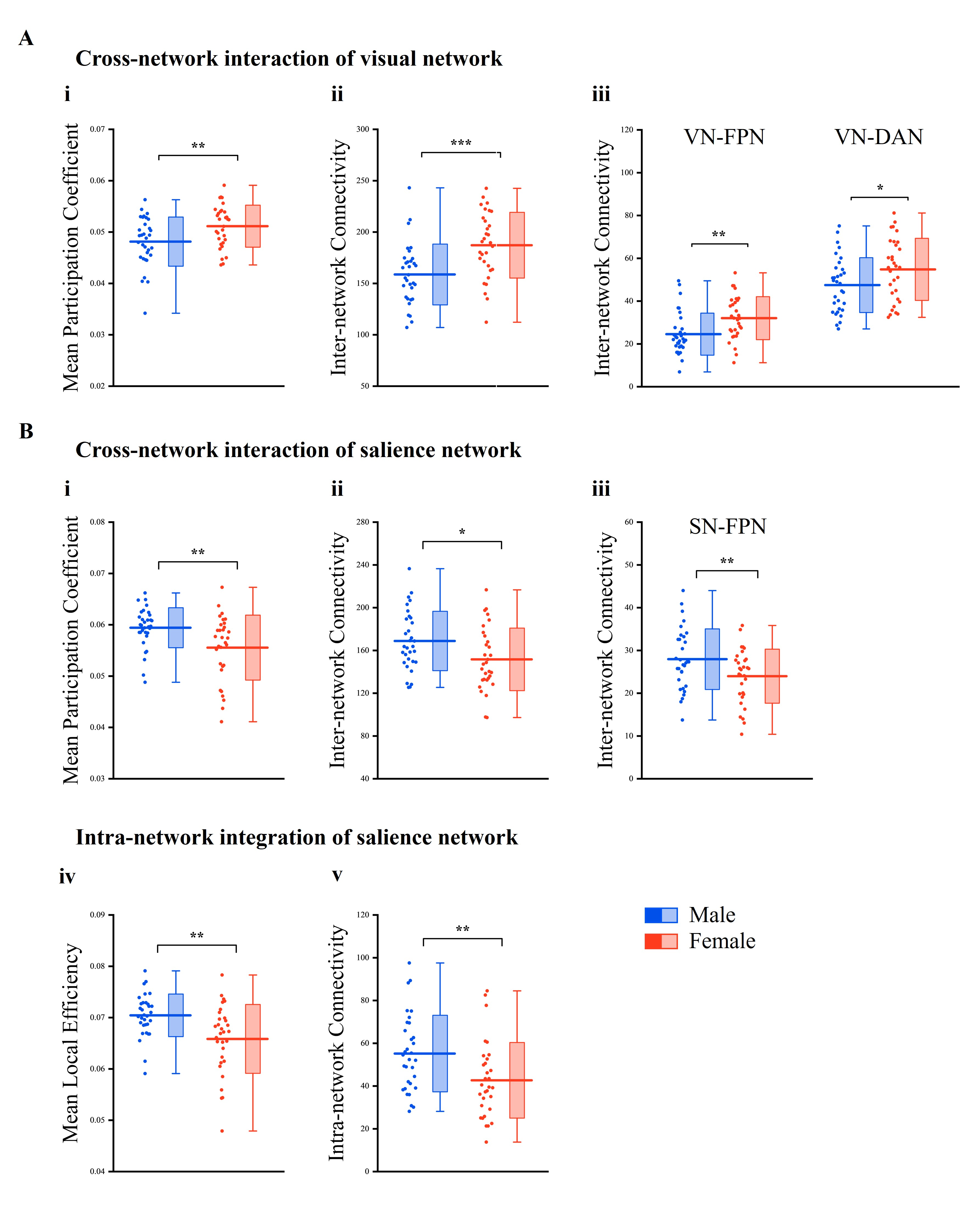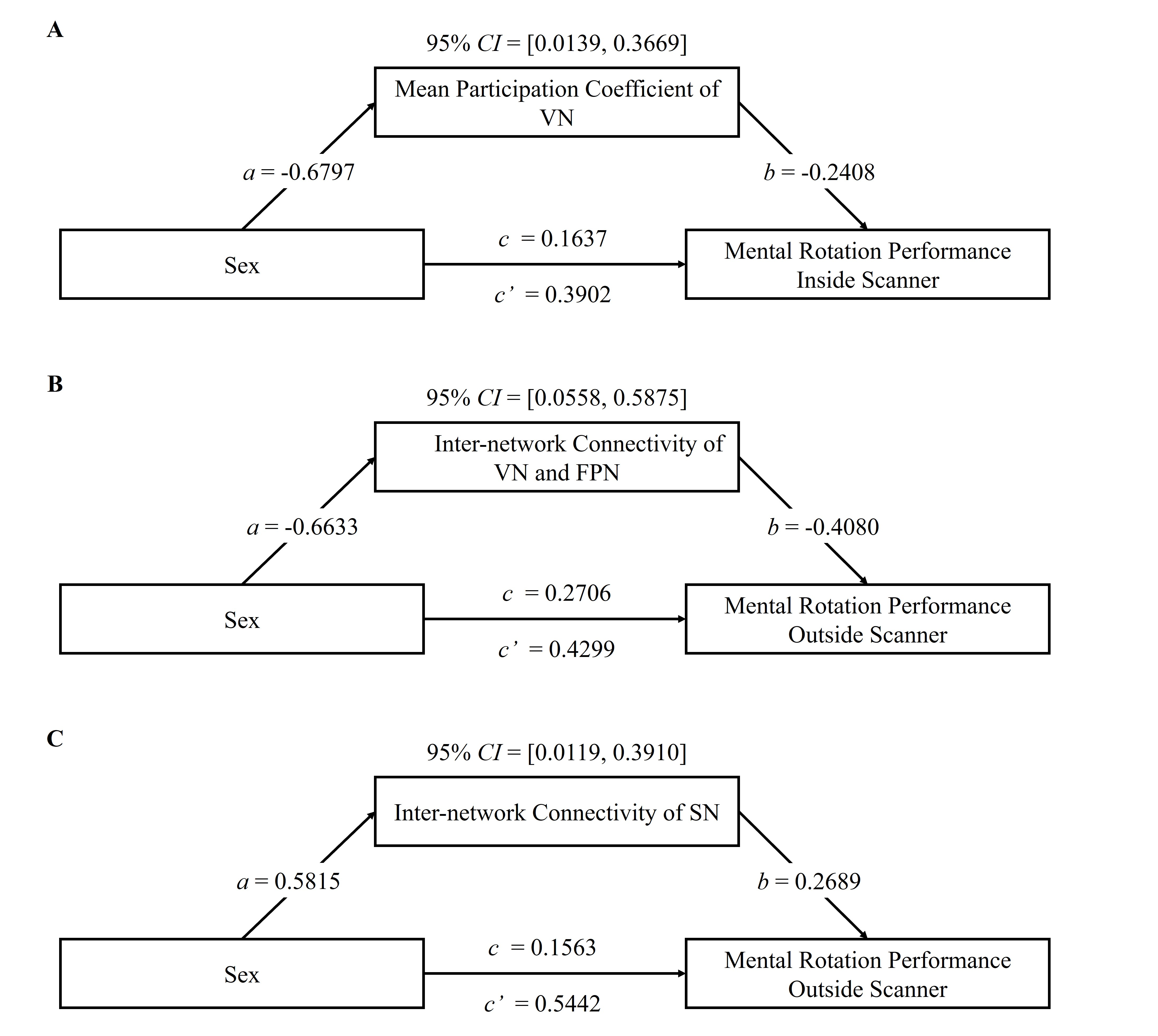 本研究采用功能磁共振成像技术对63名大学生被试(32名男性)进行扫描。所有被试在扫描中完成一项经典的三维心理旋转任务。基于大脑局部激活的分析未发现显著的性别差异,而基于功能连接的分析发现大脑功能网络连接模式存在显著的性别差异。相比于女性被试,男性被试在视觉网络表现出更低的网络间交互(网络间连接个数更少,参与系数更低),而在突显网络表现出更高的网络内整合(网络内连接个数更多,局部效率更高)和更高的网络间交互(网络间连接个数更多,参与系数更高)。心理旋转行为表现与视觉网络的网络间交互(参与系数)呈负相关,与突显网络的网络间交互(网络间连接个数)和感觉运动网络的网络内整合(局部效率)呈正相关。有趣的是,视觉网络的网络间交互与突显网络的网络间交互在性别与心理旋转行为表现之间的关系中起中介作用。
