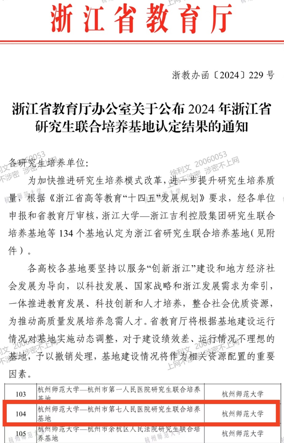 近日,浙江省教育厅发布《关于公布2024年浙江省研究生联合培养基地认定结果的通知》,经浙江省教育厅评定,天英足球即时比分 与杭州市第七人民医院联合申报的“杭州师范大学—第七人民医院研究生联合培养基地”被认定为2024年浙江省研究生联合培养基地。这是天英足球即时比分 继“杭州师范大学-杭州市天长小学”之后,获得认定的第三个省级研究生培养基地。