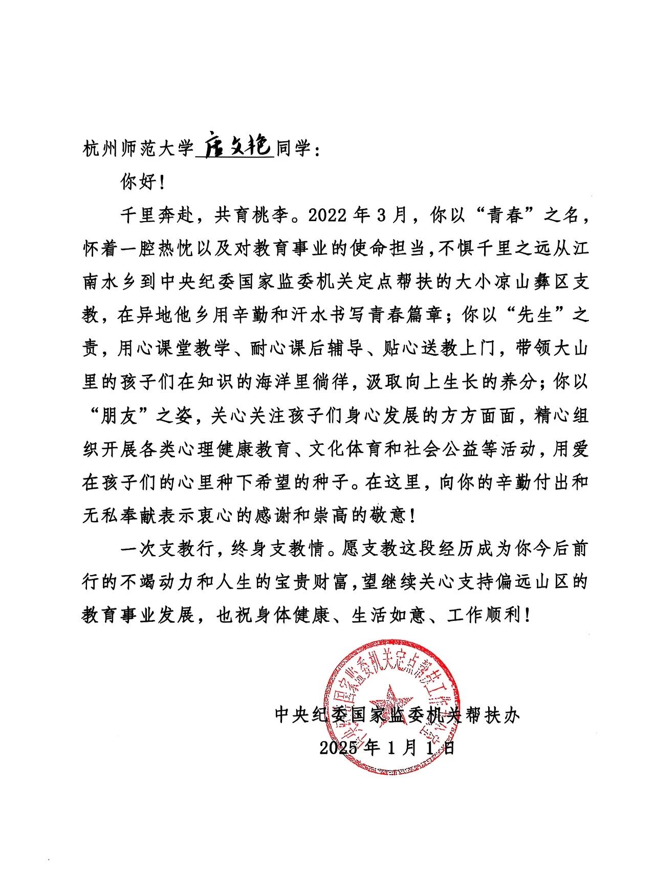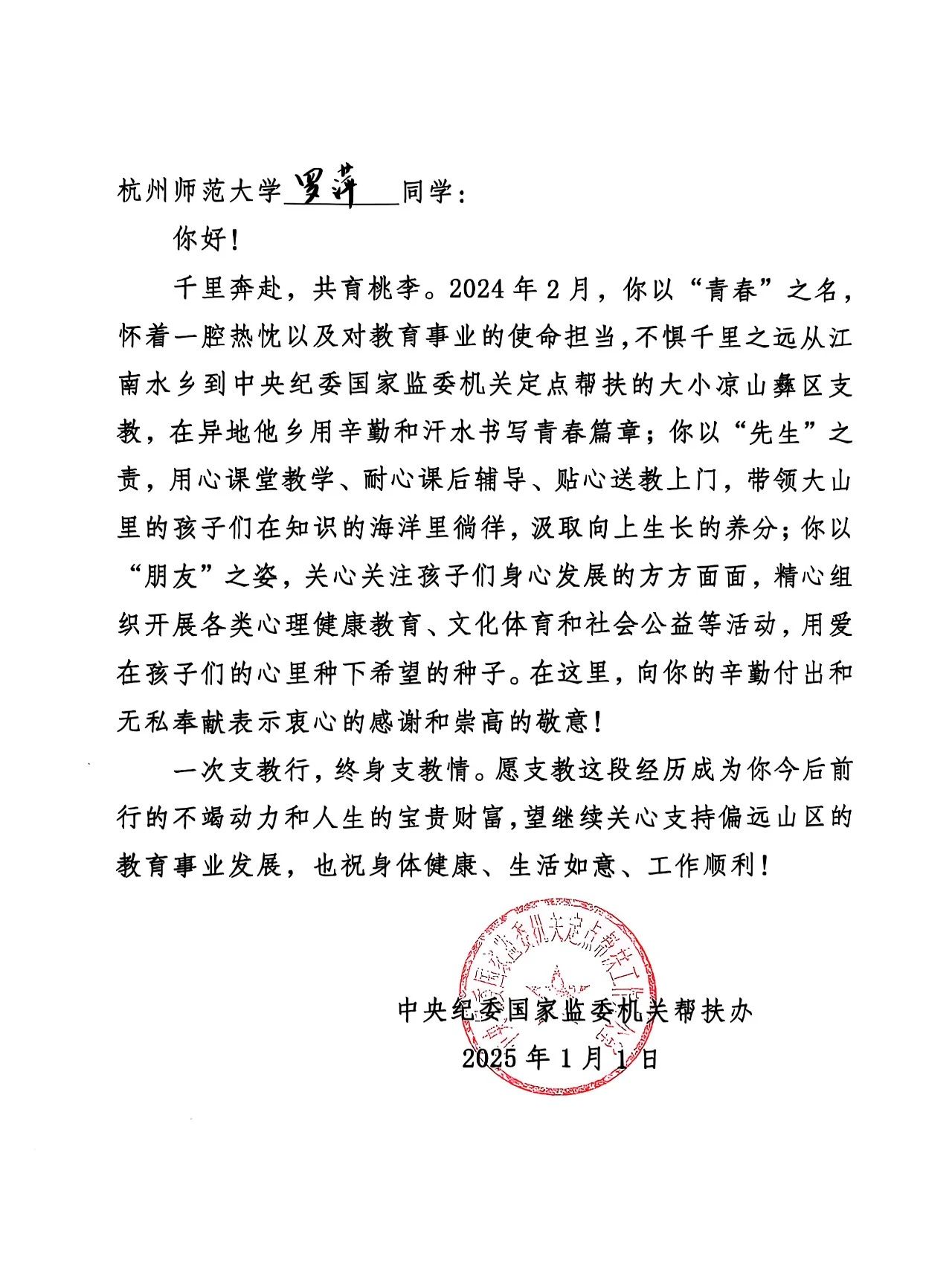 近日,中央纪委国家监委机关帮扶办向天英足球即时比分 发来感谢信,高度赞扬陈影杰、韩佳佳等9名研究生在大凉山彝区的教育帮扶工作。这封跨越山河的来信,生动诠释了教院学子以专业智慧赋能乡村教育振兴的青春担当。