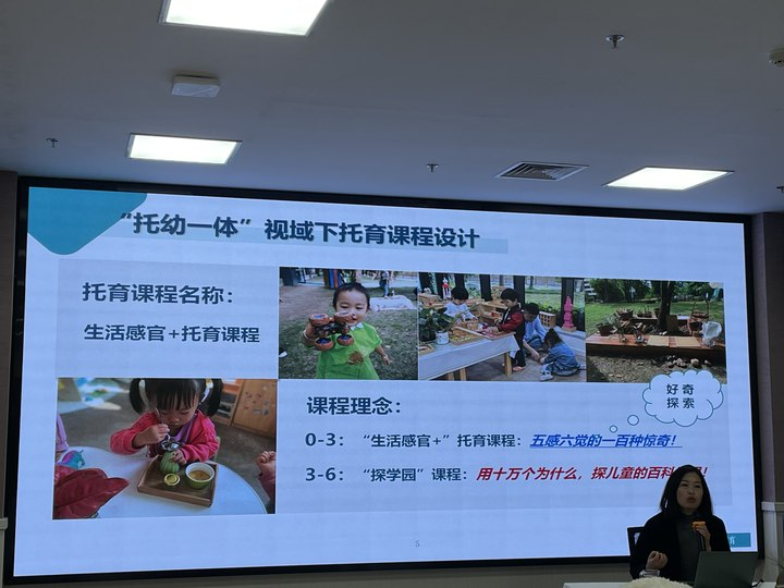 本次讲座围绕杭师大附属幼儿园0-3岁的《生活感官+》和3-6岁的《探学园》课程展开。讲座伊始,邵园长向同学们展示《生活感官+》的课程方案架构,并通过托一班的具体案例,描述了课程方案在实际教学中的运用。她指出,教师在日常生活中要善于发现儿童的兴趣点,并将其巧妙地融入到感官教育中。例如,在区角的设计中融入感官刺激,可以有效提升幼儿的参与度和积极性;利用不同质地的材料、色彩、声音等刺激婴幼儿的感官,促进其认知、语言、社会性等方面的发展。邵园长特别强调,在生活教育+托育课程中,环境应该具有“生活、自然、友好”这样的特点。