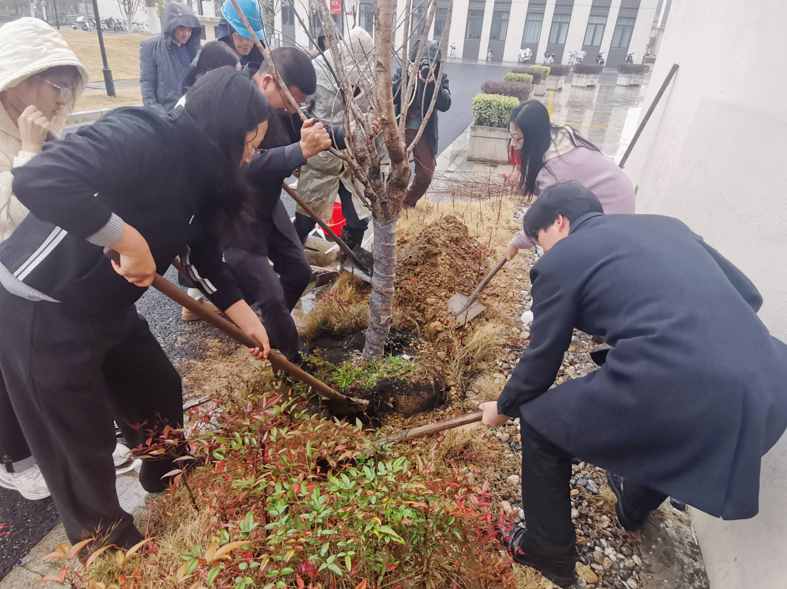3月12日植树节当天,学院师生延续劳动热情,在诚园6号楼下开展樱花树种植活动。学院领导与同学们挥锹培土、扶苗定根,合力栽下樱花树苗。