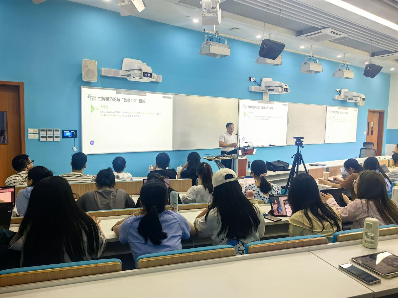 5月14日,深圳市南山区外国语学校(集团)香山里小学副校长何海银应邀在杭州师范大学仓前校区诚园112会议室开展题为《基于“融创共生”理念的AI技术赋能教育生态——香山里小学未来学校的场景重构与共生实践》的专题讲座。讲座由教育技术学系系主任徐光涛老师主持,来自教育技术学、小学教育等专业148名学生参加了本次讲座,部分同学在 108教室观看同步直播。作为教育信息化领域的资深专家,何海银结合香山里小学的实践经验,为在场师生带来了一场关于AI技术与教育深度融合的思想盛宴。