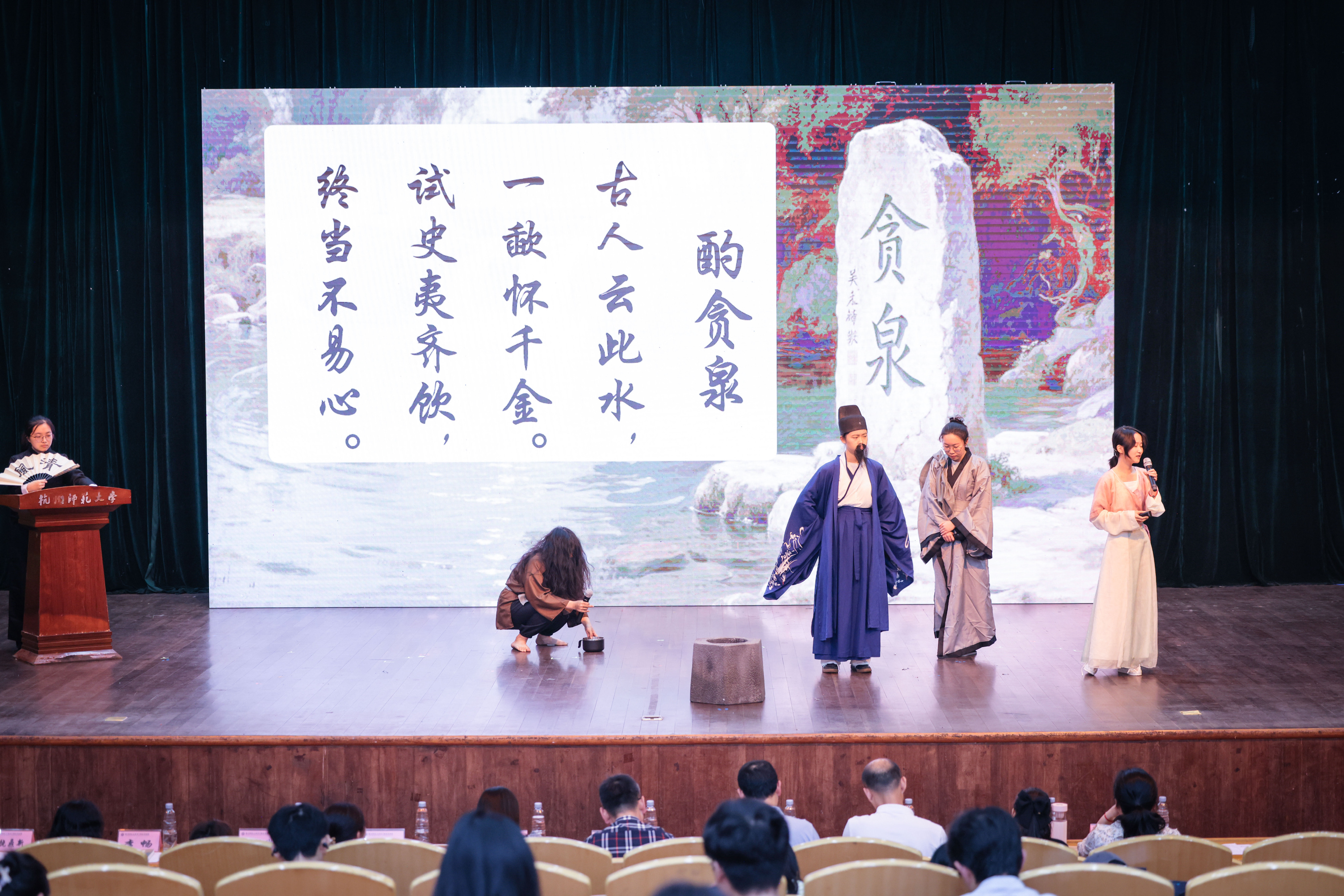 本次展演从众多作品中层层筛选出6个精品剧目,以“穿越千年的廉洁传承”为主线:明代宋濂“雪夜还书”的诚信守诺、琅琊王氏“世代清廉”的门风故事、苏轼家族“不取非分财”的治家智慧、东晋吴隐之“敢饮贪泉水”的刚正不阿、杜甫“大庇天下寒士”的家国情怀,通过沉浸式舞台剧、情景朗诵等形式立体呈现。尤为亮眼的是“穿越”创意设计——当剧中廉吏与当代师范生跨时空对话,“廉洁奉公”的古今共鸣引发全场深思。