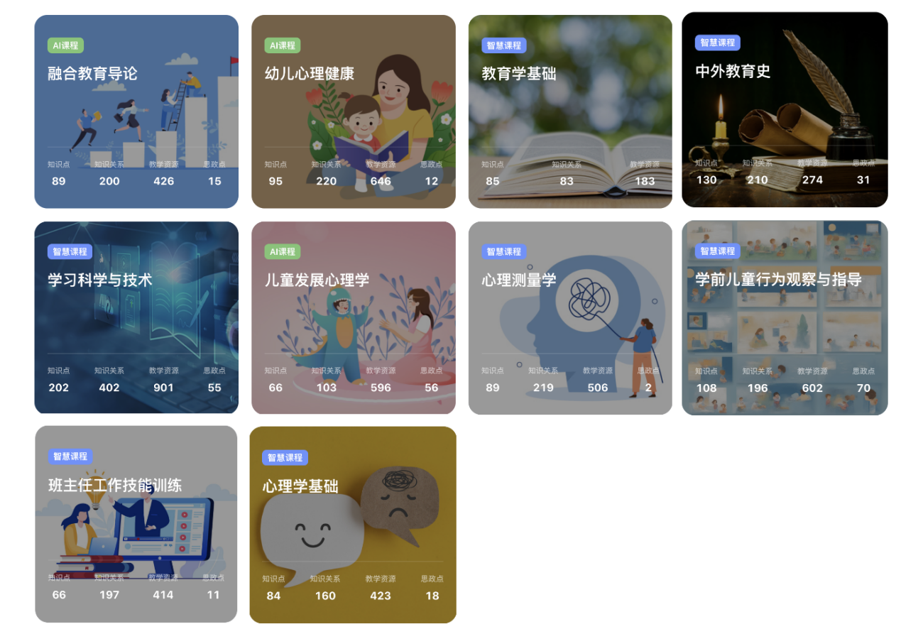 10门课程覆盖小学教育、学前教育、特殊教育、教育技术学、应用心理学等专业,包含7门智慧课程,3门AI课程。在内容建设方面,课程深度融合数字化资源、知识图谱与人工智能技术三要素,构建了体系化、结构化、可视化的知识结构,通过知识脉络更好地展示知识之间的关系和层次,同时搭建知识点学习空间,探索知识点所对应的数字化资源,助力学生系统掌握课程的核心知识点。