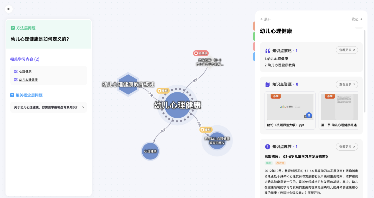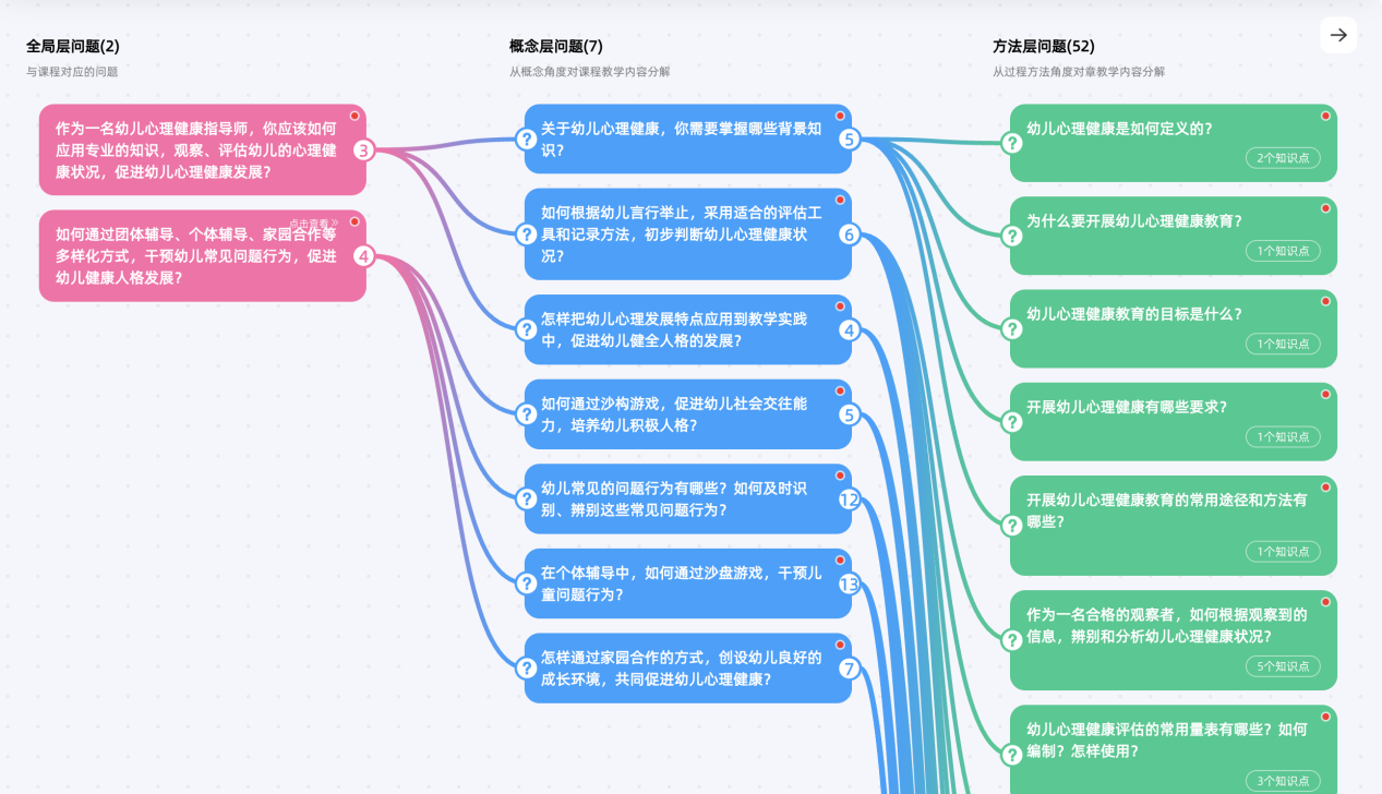 在丰富教学内容的同时,构建以问题和能力为导向的图谱体系,实现从理论知识到实际能力的有效转化,使得教学过程更加精准高效。以《幼儿心理健康》课程为例,建设61个深入探讨的问题以及12项核心能力的培养目标,帮助学生将所学知识点综合应用于幼儿心理观察、辨别和辅导。