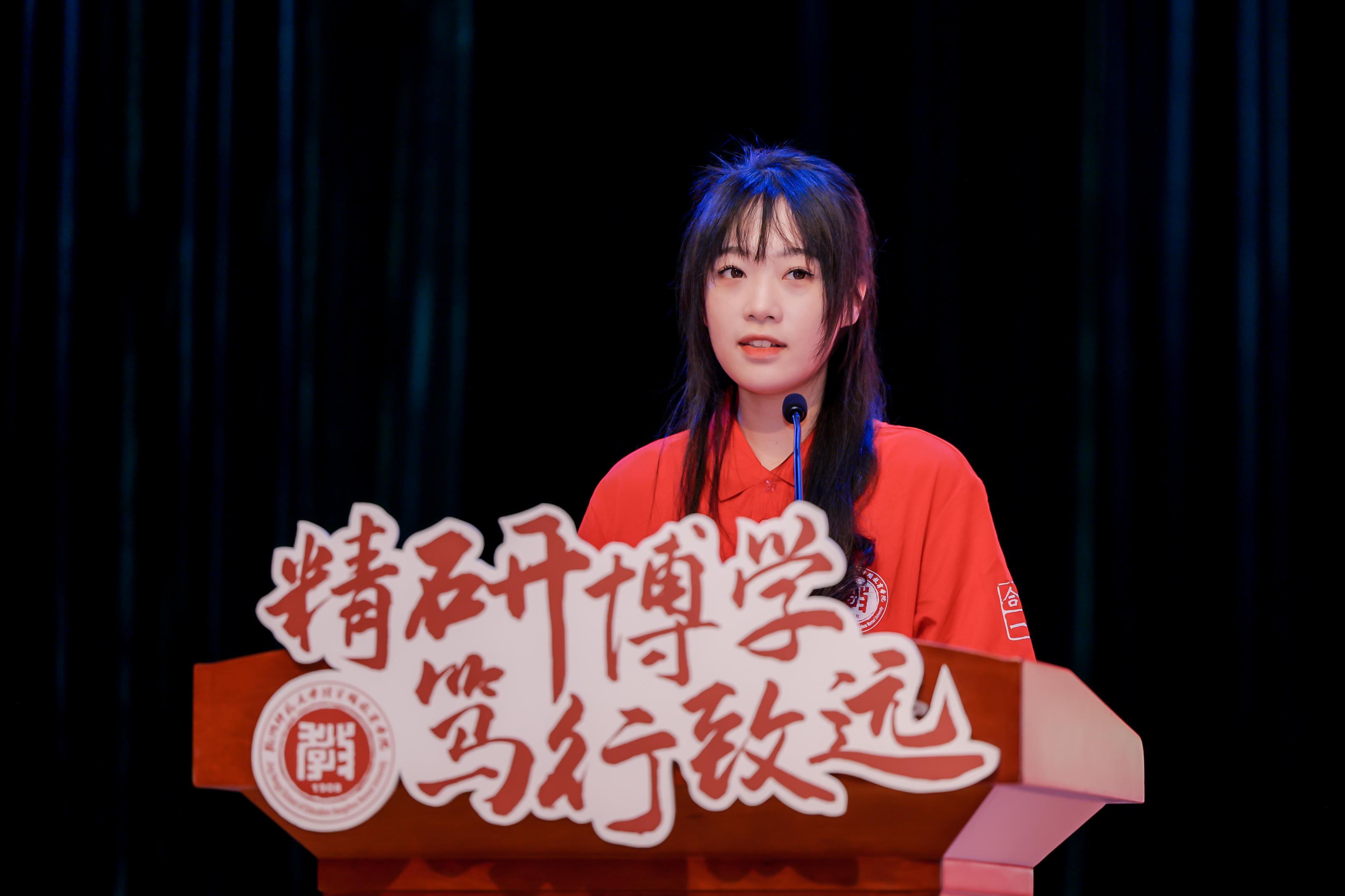 2025级硕士新生代表刘馨仪同学结合个人成长经历分享了其对教育意义的理解。她亲身感受到教育“激励、唤醒和鼓舞”的力量,正是教师的信任与关怀帮助她突破自我、勇敢发声。她号召同学们秉持“勤慎诚恕、博雅精进”的校训精神,不畏挑战、踏实前行,在学术钻研、教学实践和交流反思中追求卓越、实现成长。