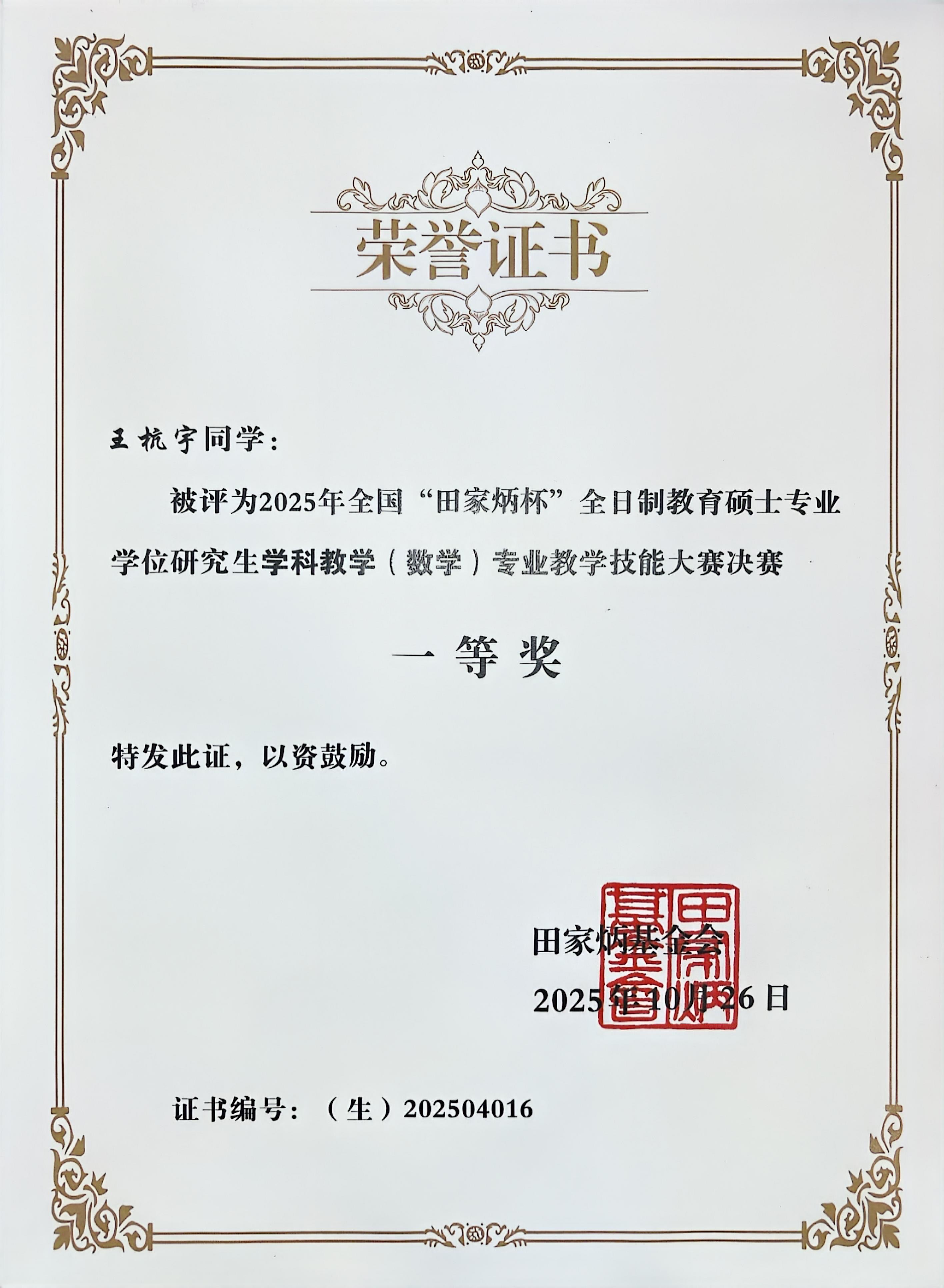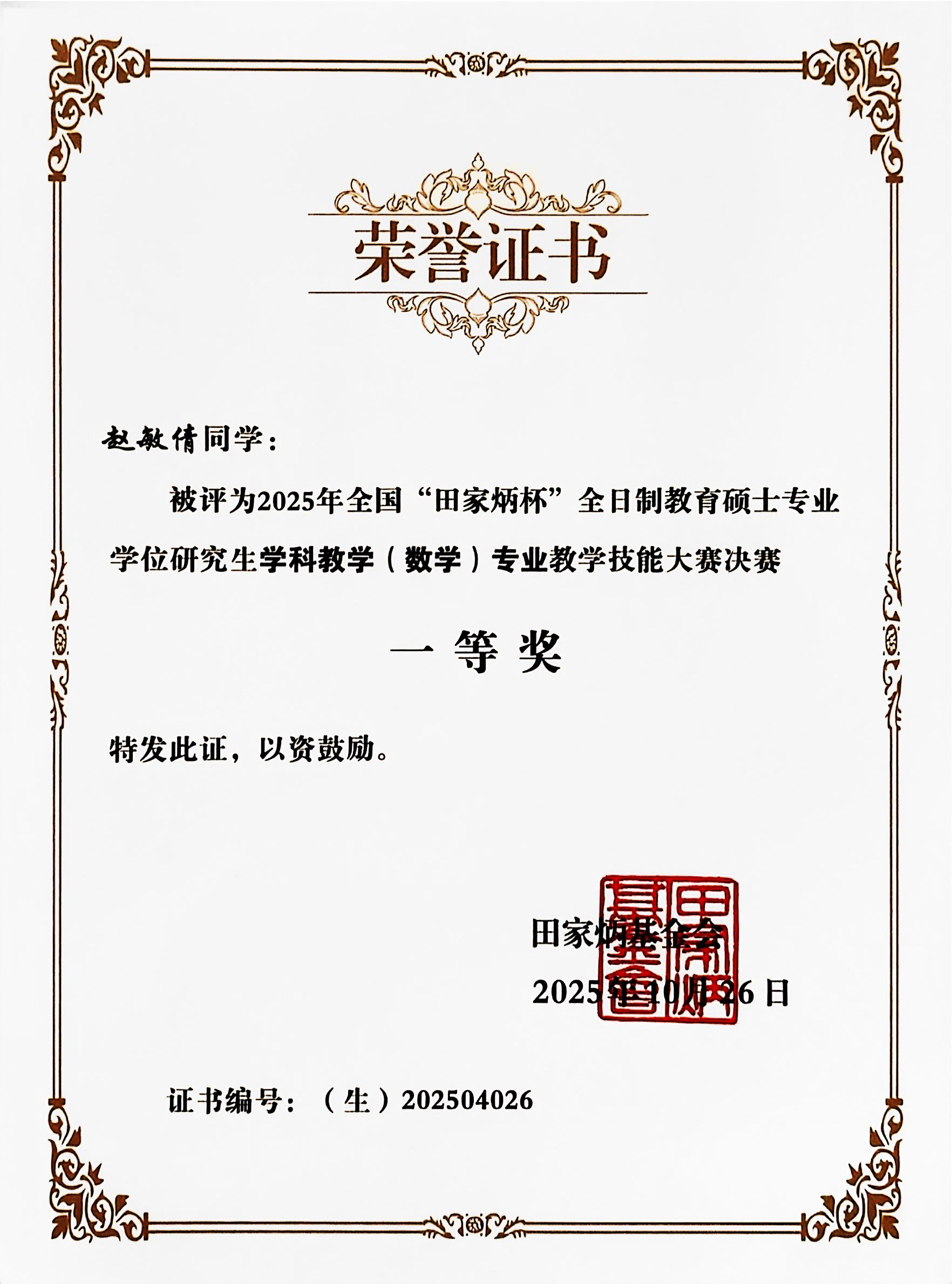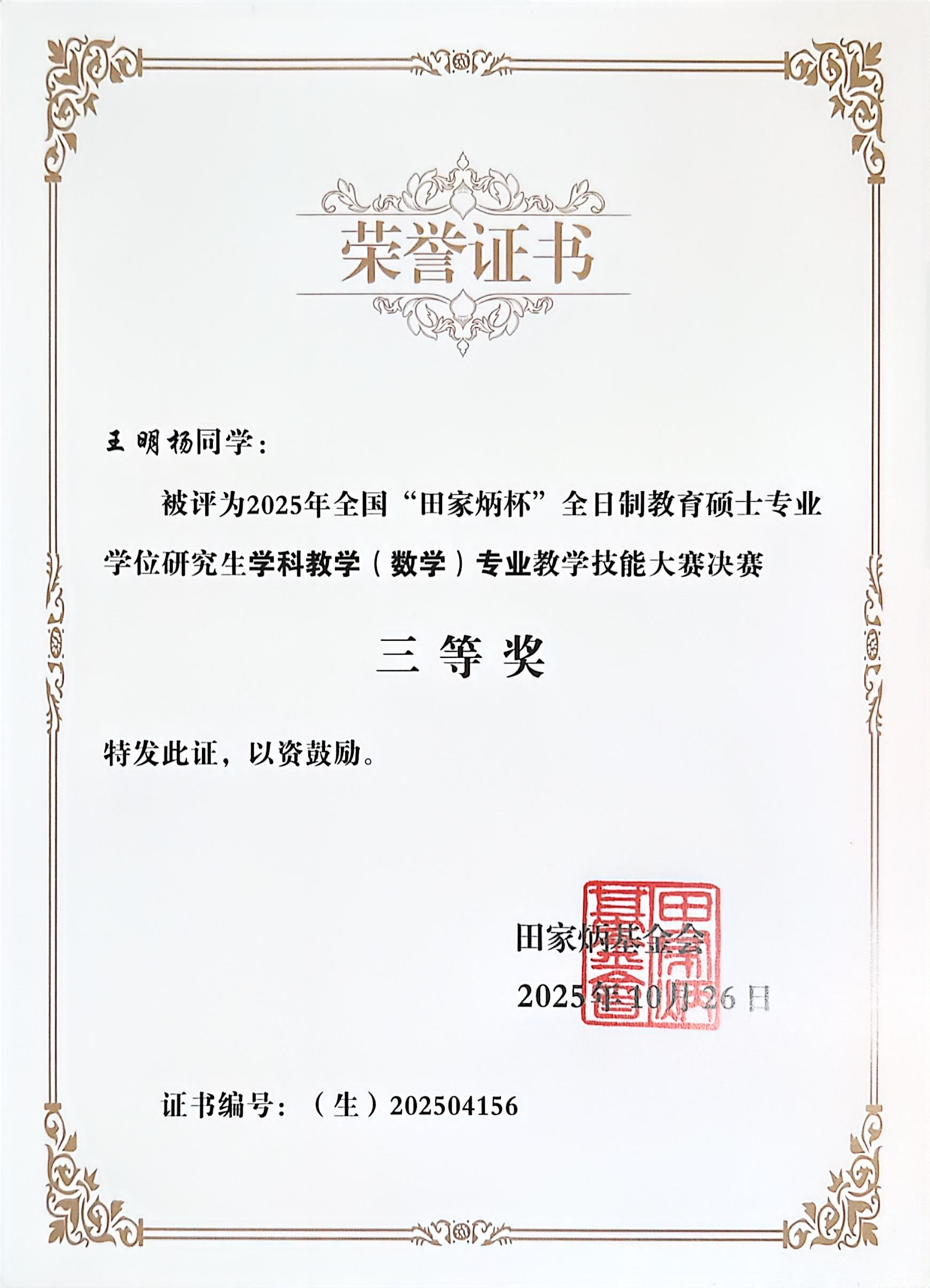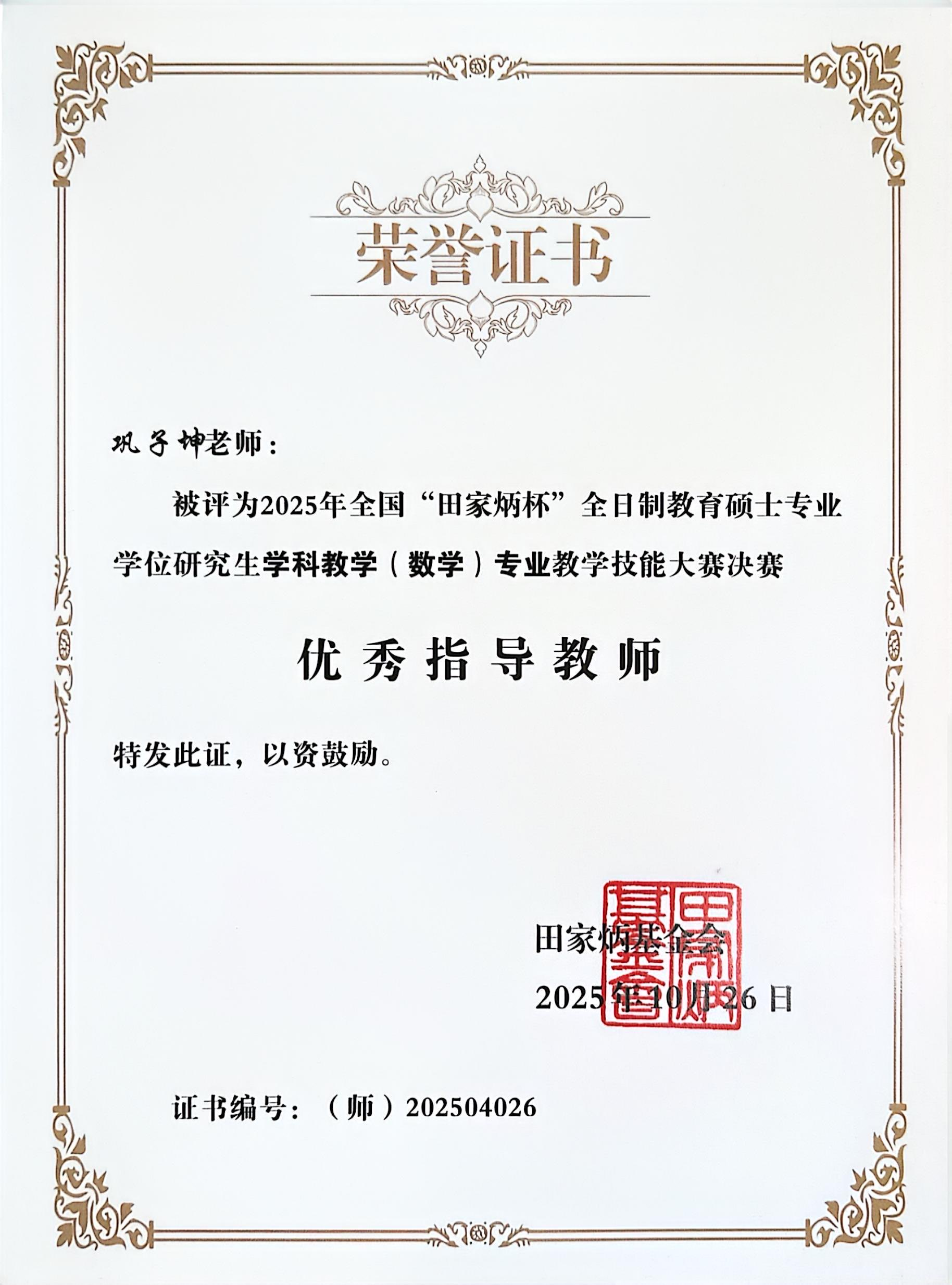 10月24-27日,2025年全国“田家炳杯”全日制教育硕士学科教学(数学)专业教学技能大赛在西华师范大学举行决赛,我院研究生在决赛中喜获佳绩。2023级学科教学(数学)研究生赵敏倩、王杭宇荣获一等奖,王明杨、孔依晨荣获三等奖;巩子坤、斯海霞老师分别获得“田家炳杯”全日制教育硕士专业学位研究生学科教学(数学)专业教学技能大赛优秀指导教师的荣誉。
