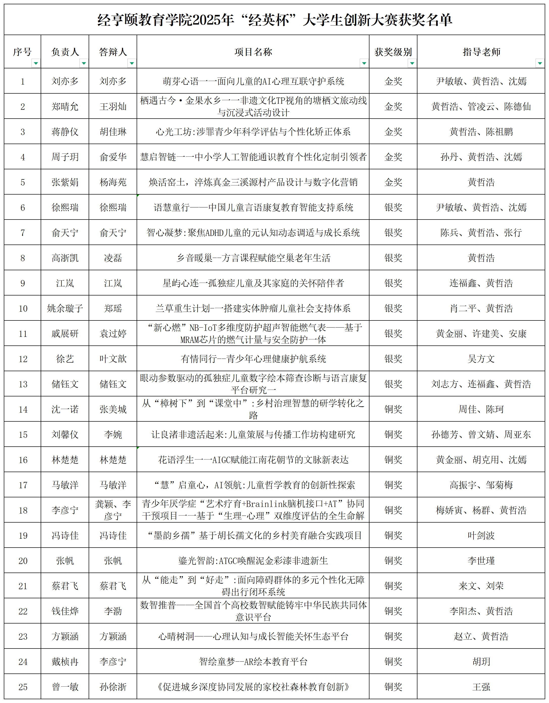 本次2025年“经英杯”大学生创新大赛共有40余个项目报名,共有25个项目入围决赛进行现场路演和答辩。最终评选出金奖5个、银奖8个、铜奖12个。现将获奖名单公示如下: